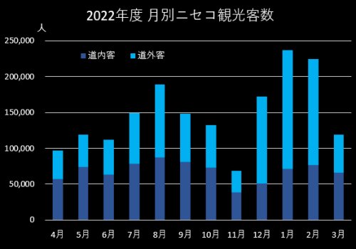 ニセコでの観光客数の特徴は、1月と8月にピー クを持つ二峰型です。スキシーズンの冬と、様々なアウトドスポーツを楽しむこができる夏にニセコの魅力を感じ人が多い。ニセコの温泉の魅力も国内外から注目さています。