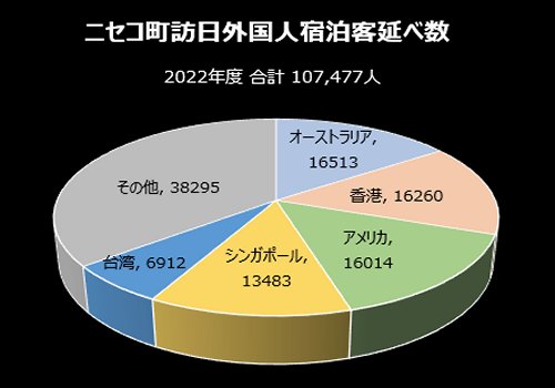 ニセコ町への外国人宿泊客 (延べ) 数は、右肩上がりで増加してます。 国別の状況は、アジア、オセアニアからの来訪者が多く、近年は東南アジアや欧米諸国からの入込も増加しています。継続的な海外向けのプロモーションやこまめな情報発信などにより、ニセコエリア のスノーリゾートとしての認知度が上がったことが主な要因と推測されます。